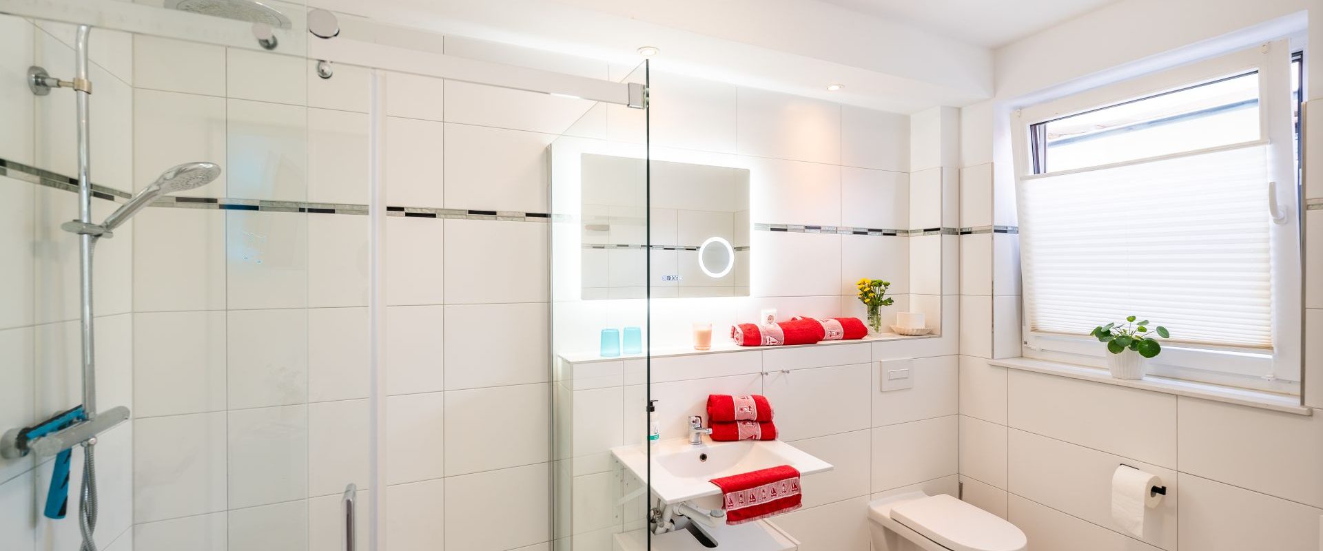 Bad mit WB mit Unterschrank, WC und Dusche. Achtung Wäschepaket (Bettwäsche + Handtücher) und Tiefgarage/PKW Stellplatz sind immer optional und zu buchbar.