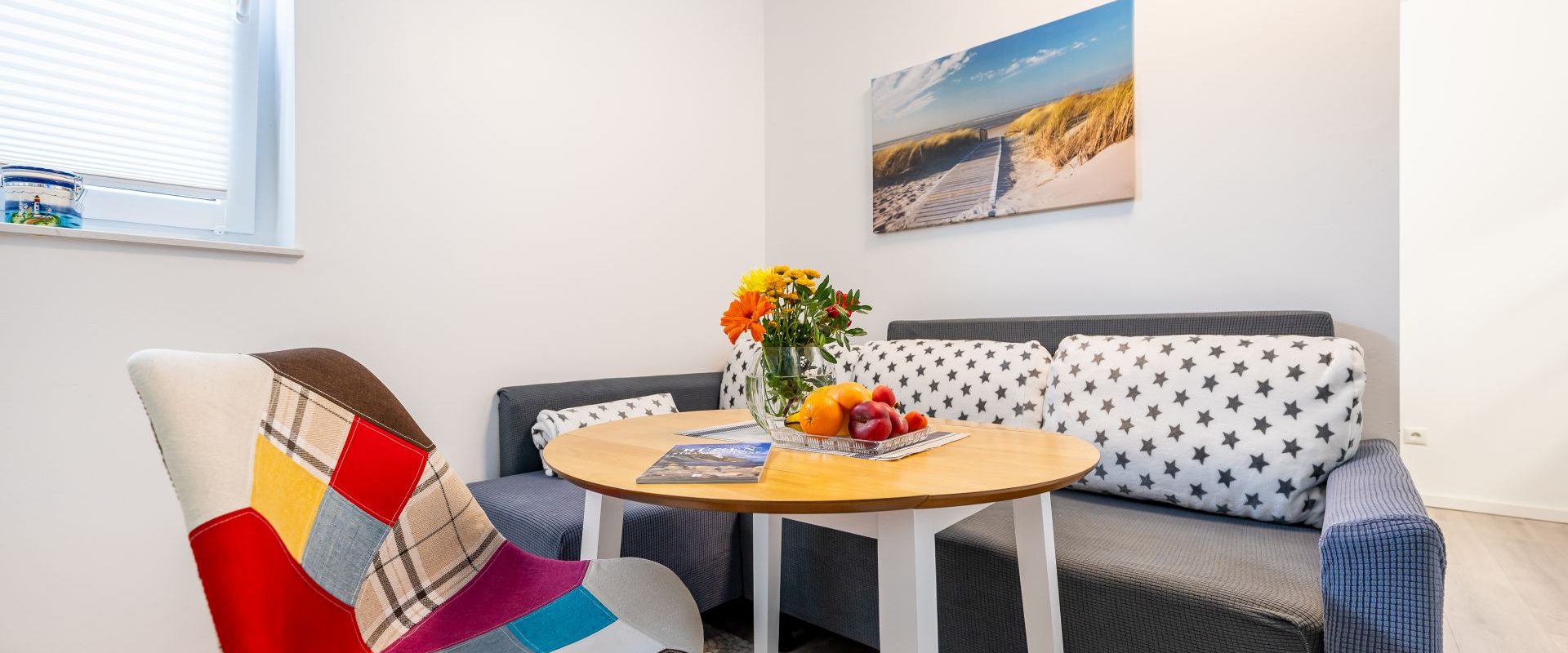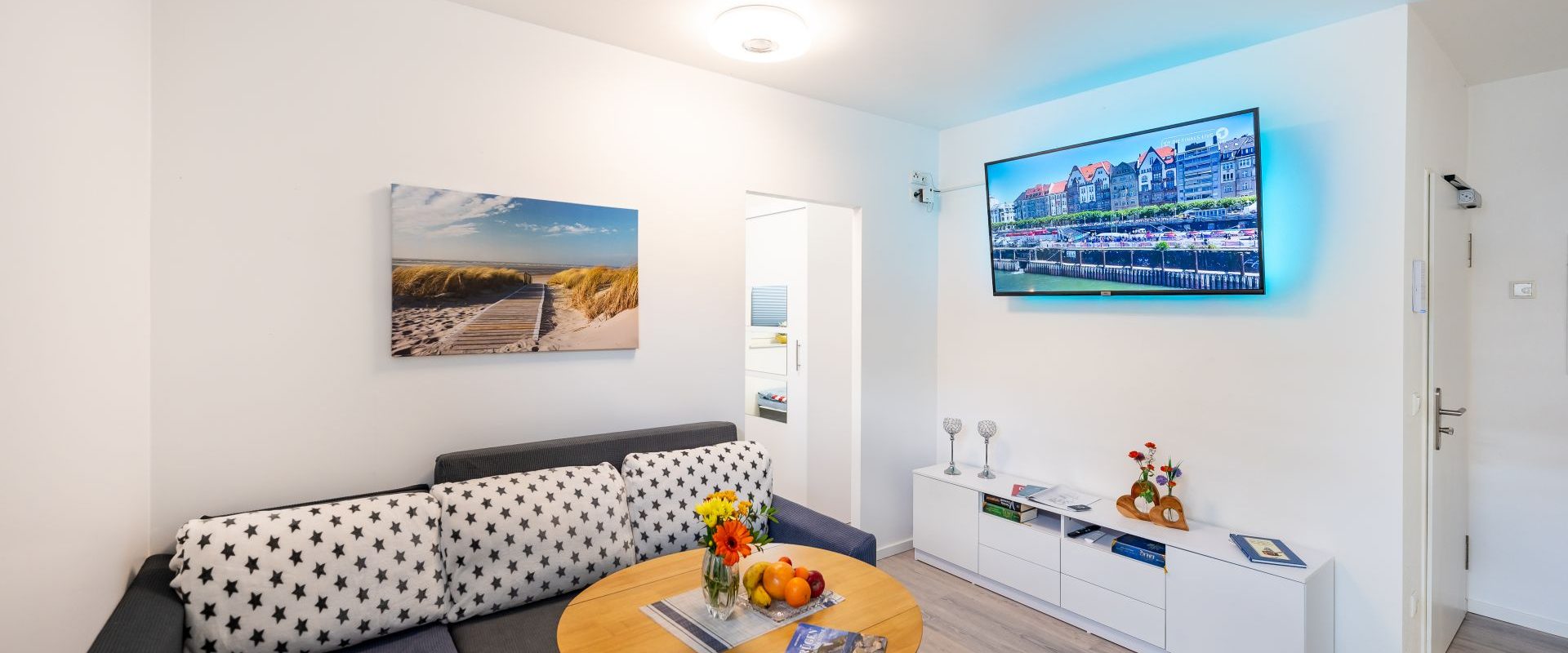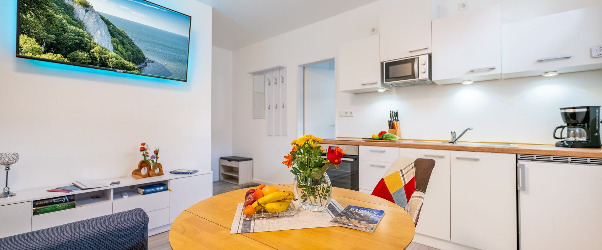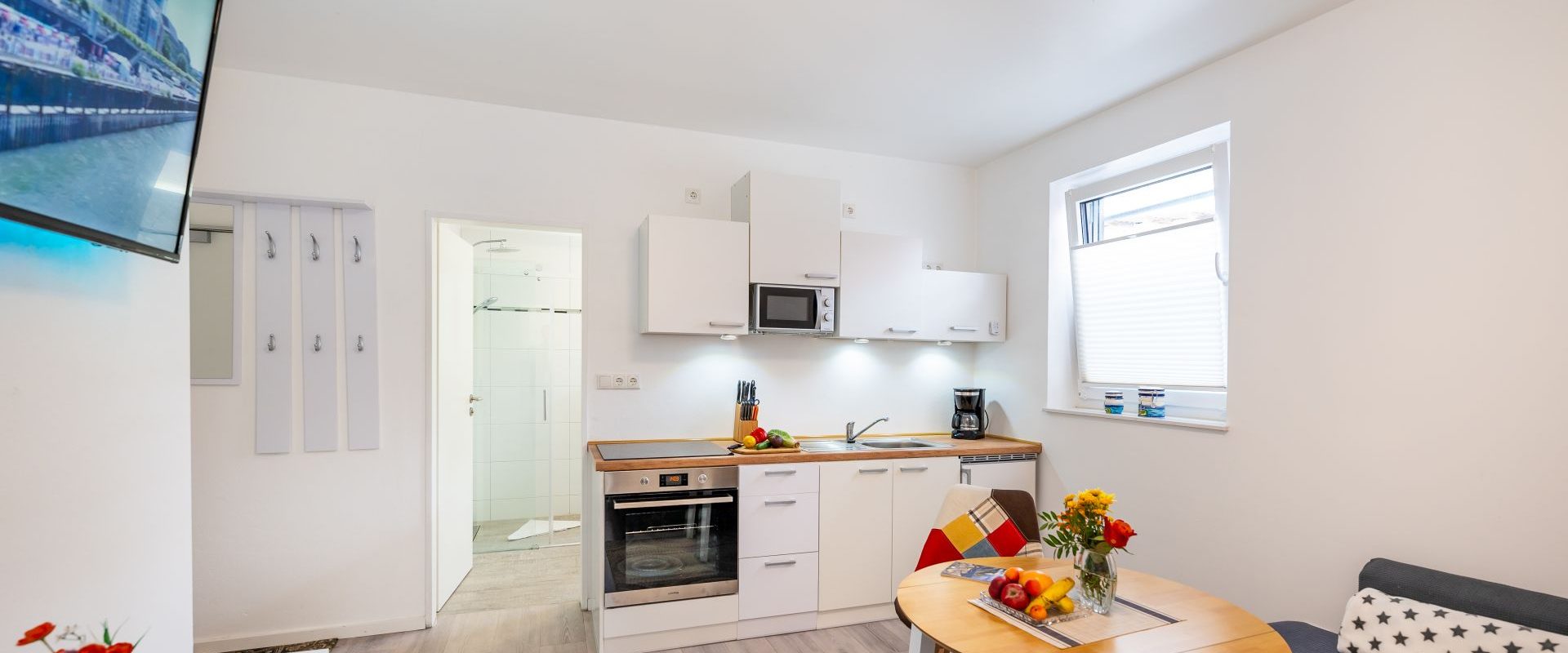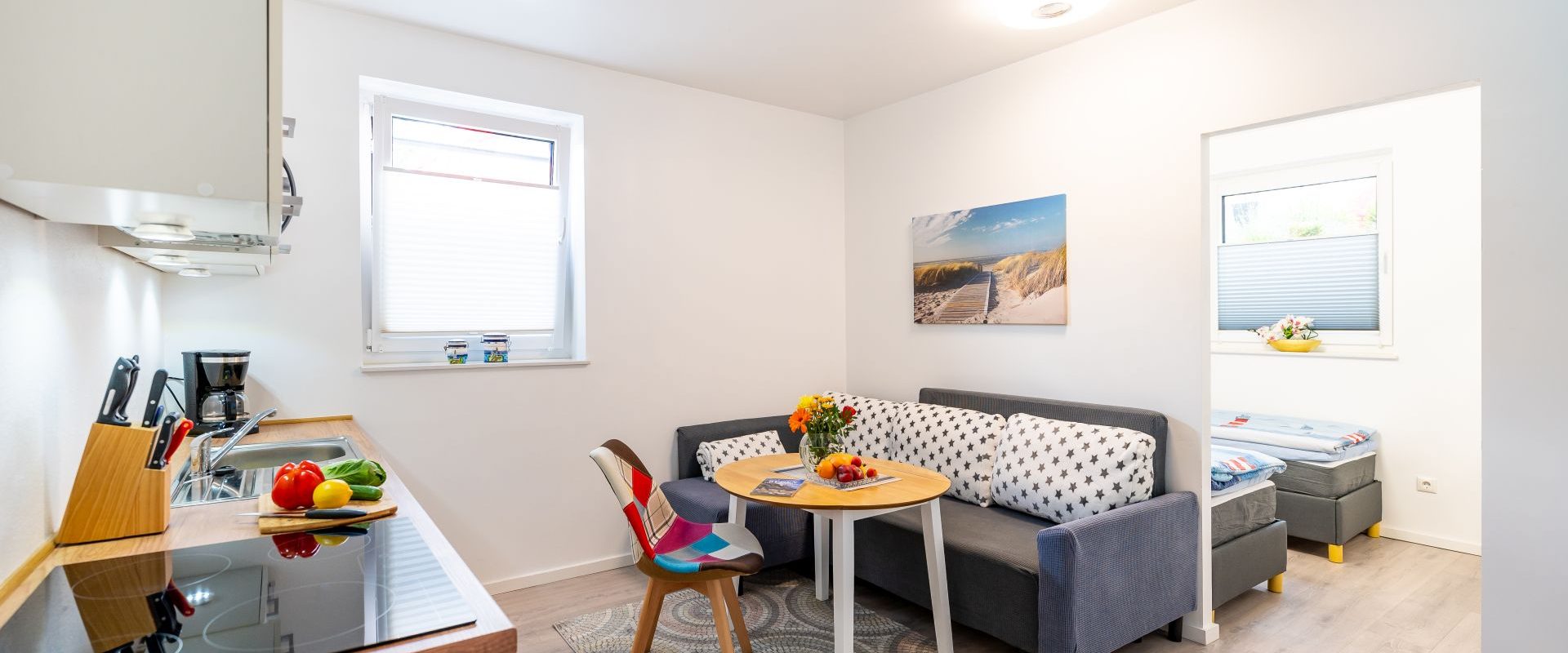 Wohnung K1 für 1-2 Pers.: Moderne 2-Zimmerwohnung mit 25 qm Wohnfläche, Souterrain. Kleiner Wohn-/Essbereich mit Sofa, runder Tisch und Stuhl, Flachbild-TV mit Internetradio, moderne Küchenzeile Ceranplatten E-Herd, Backofen, Mikrowelle, Spüle, Toaster, Wasserkocher, Kaffeemaschine.
